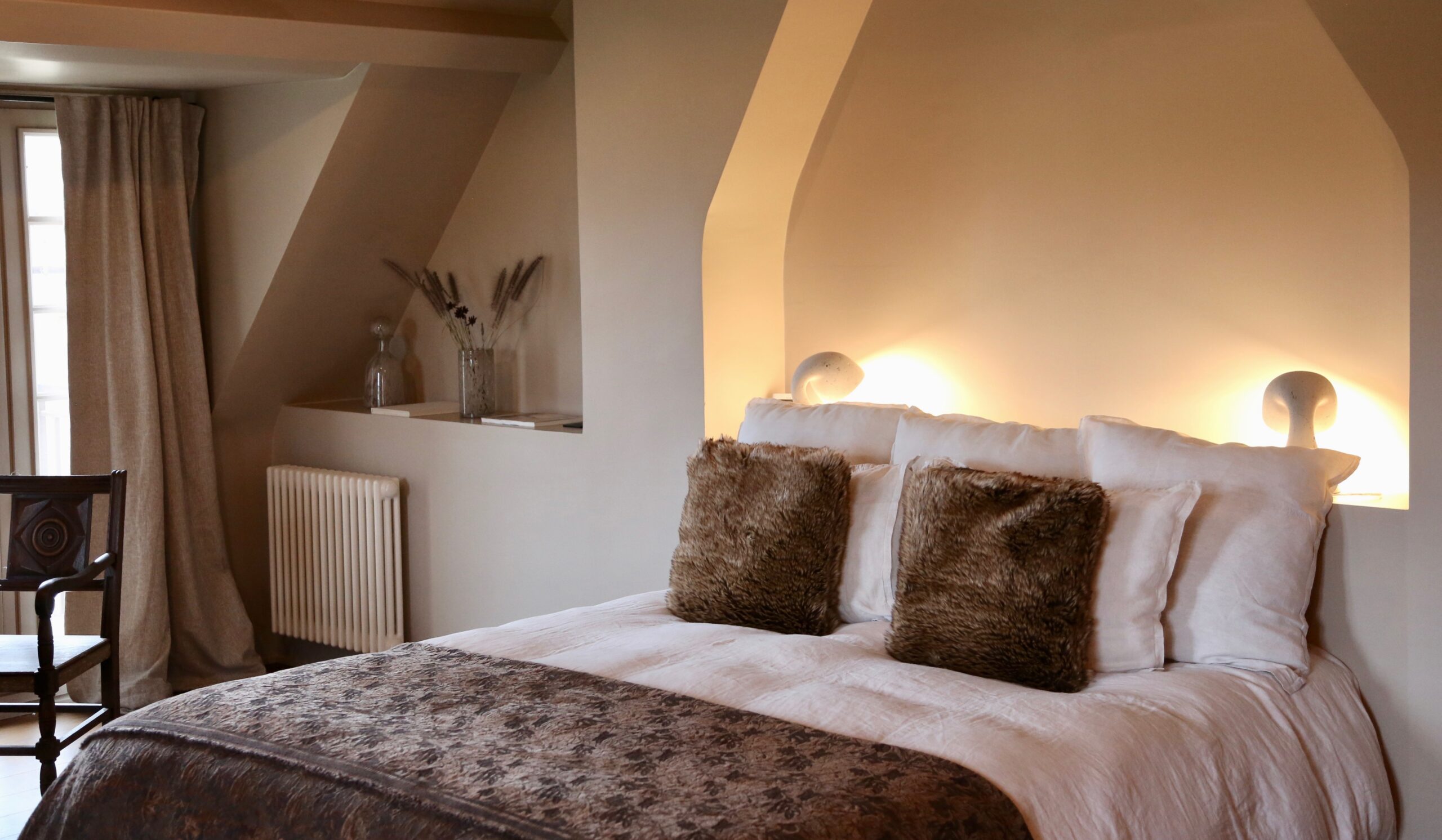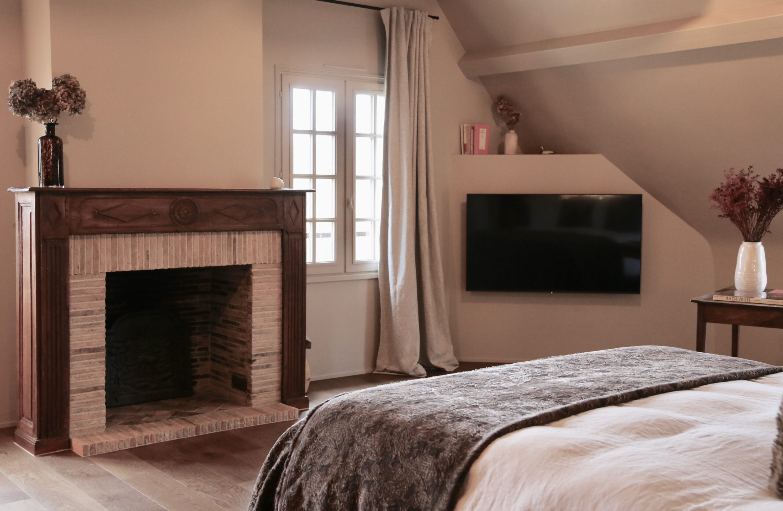 La magie de la suite Montana avec sa vue unique sur la campagne et les grands espaces. Située dans la Grande Casa au coeur de Casamaas, elle est spacieuse et originale. Elle conjugue l'ancien avec sa grande salle de bain en marbre et un style contemporain épuré.
